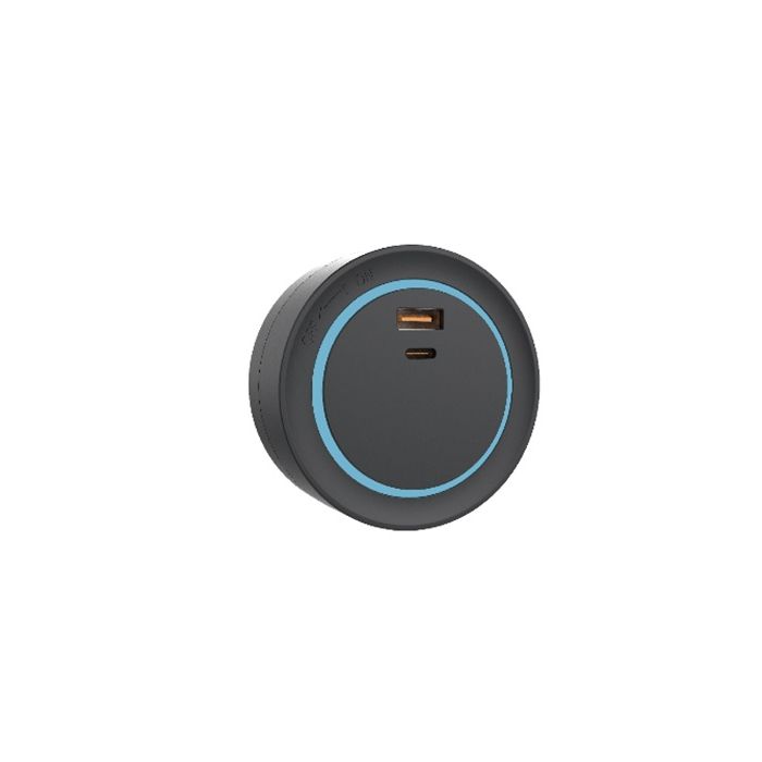 电源轨道的滑动插座。带 USB-A 和 USB C 充电端口的可拆离滑动插座。最大输出功率为 20W。