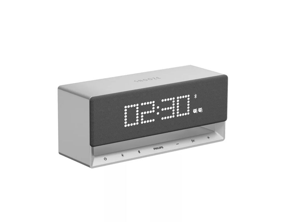 这款蓝牙闹钟织物环绕的背部是一个闪光的大数字时间显示屏。